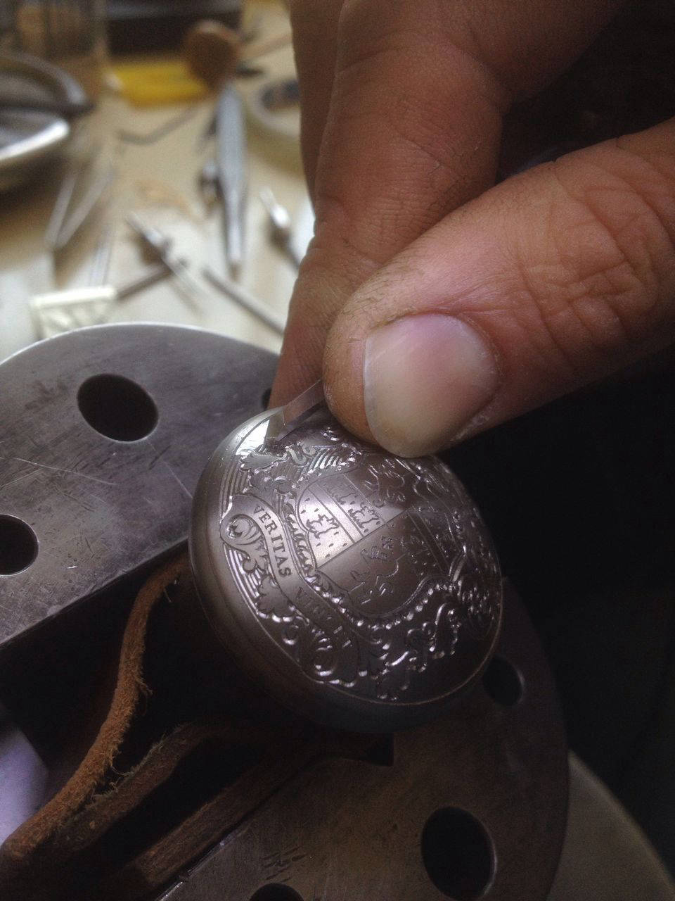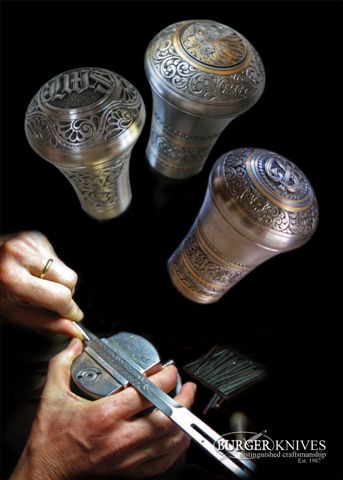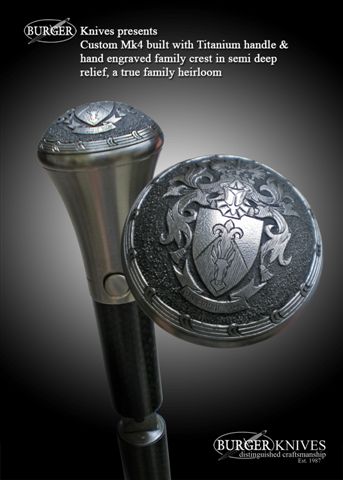 The next level of custom work is our –Bespoke Best Grade- hand engraving in semi deep relief, this level of custom hand engraving is best suited for our unique hand turned Titanium handle and hand cast 925 sterling silver handle range only. This level of custom work starts at $650- and adds approximately six to ten weeks to the custom build, depending on the engraving layout and details.