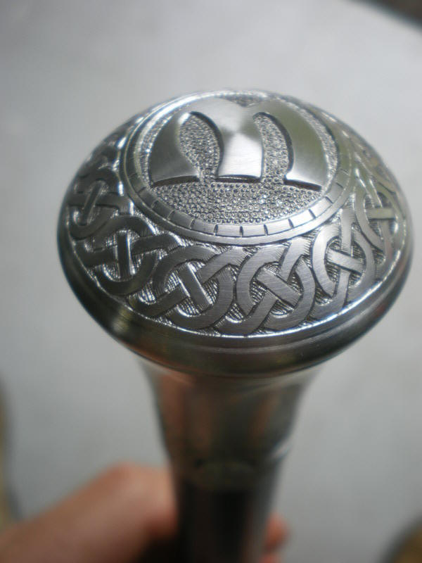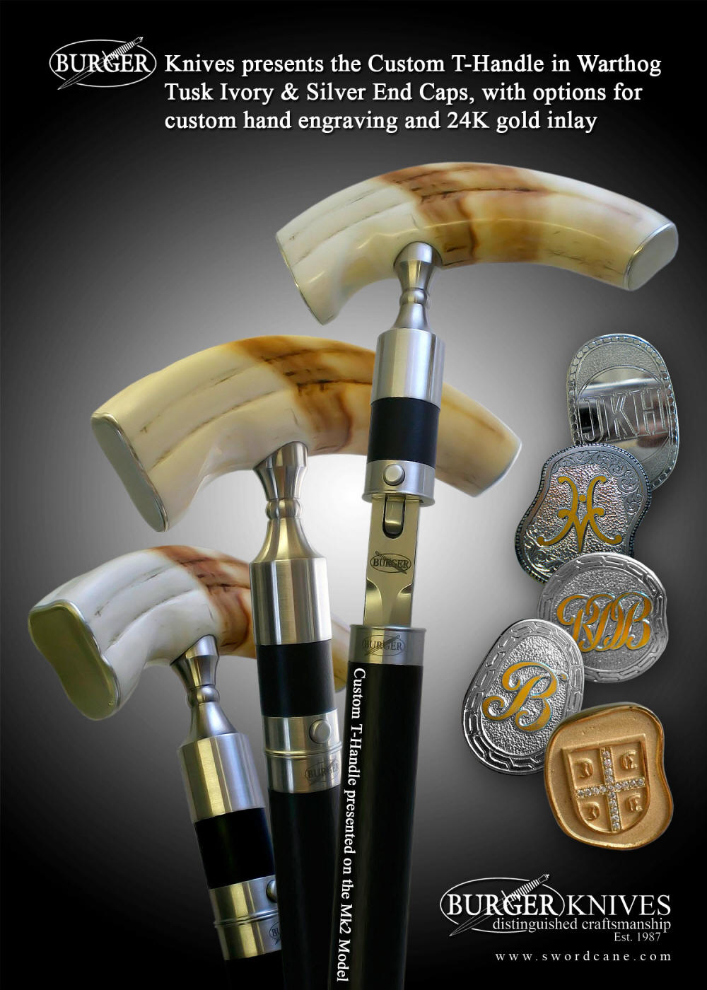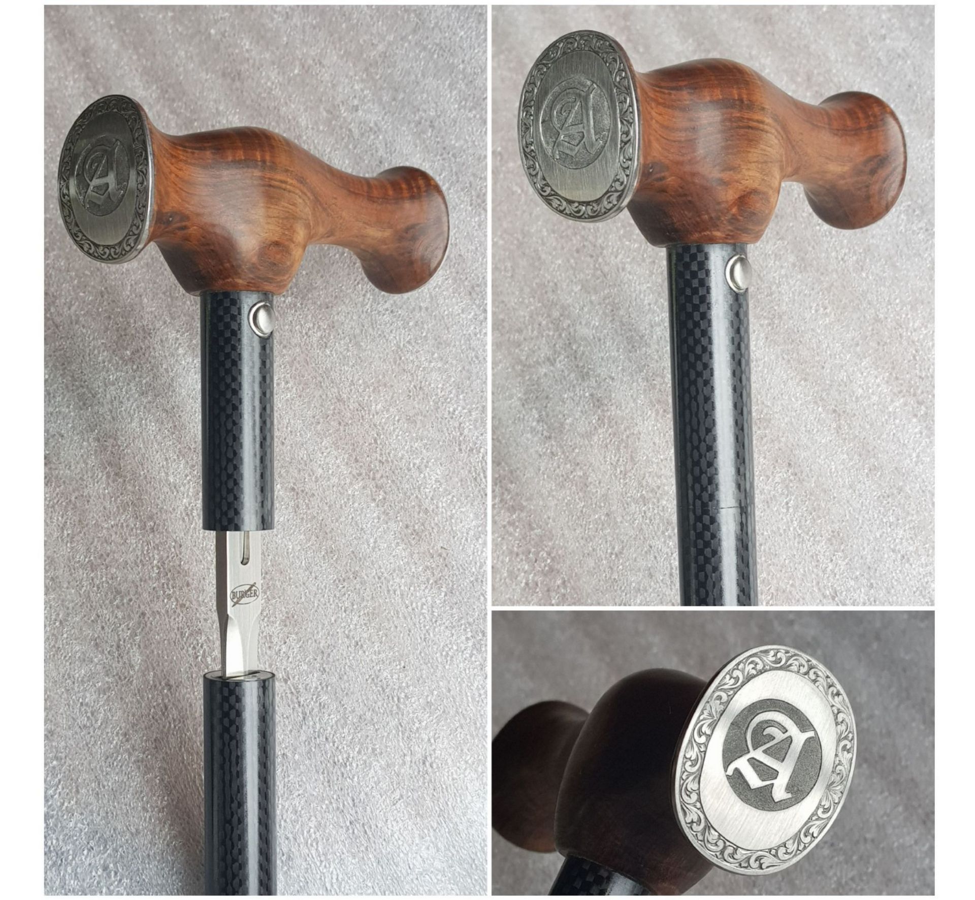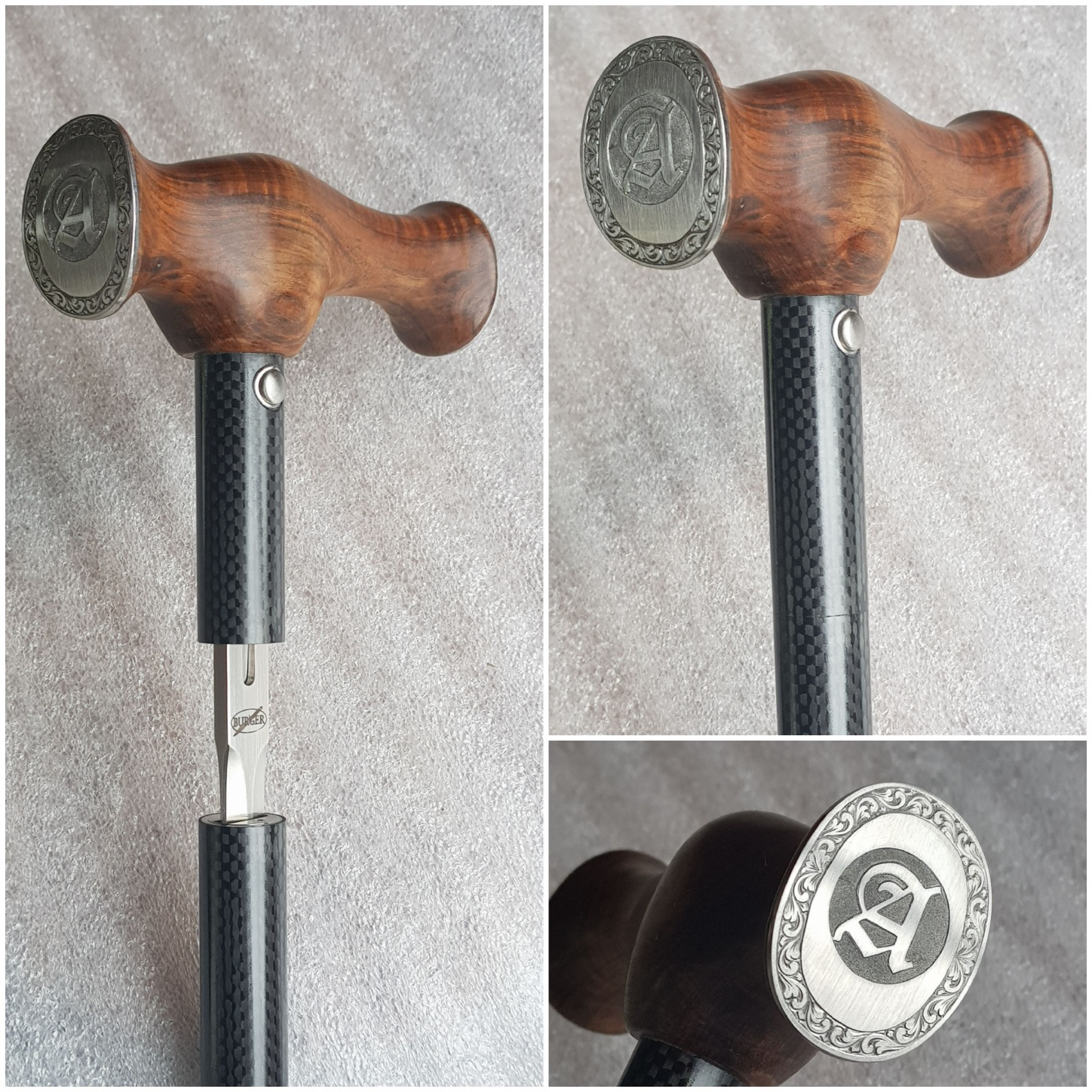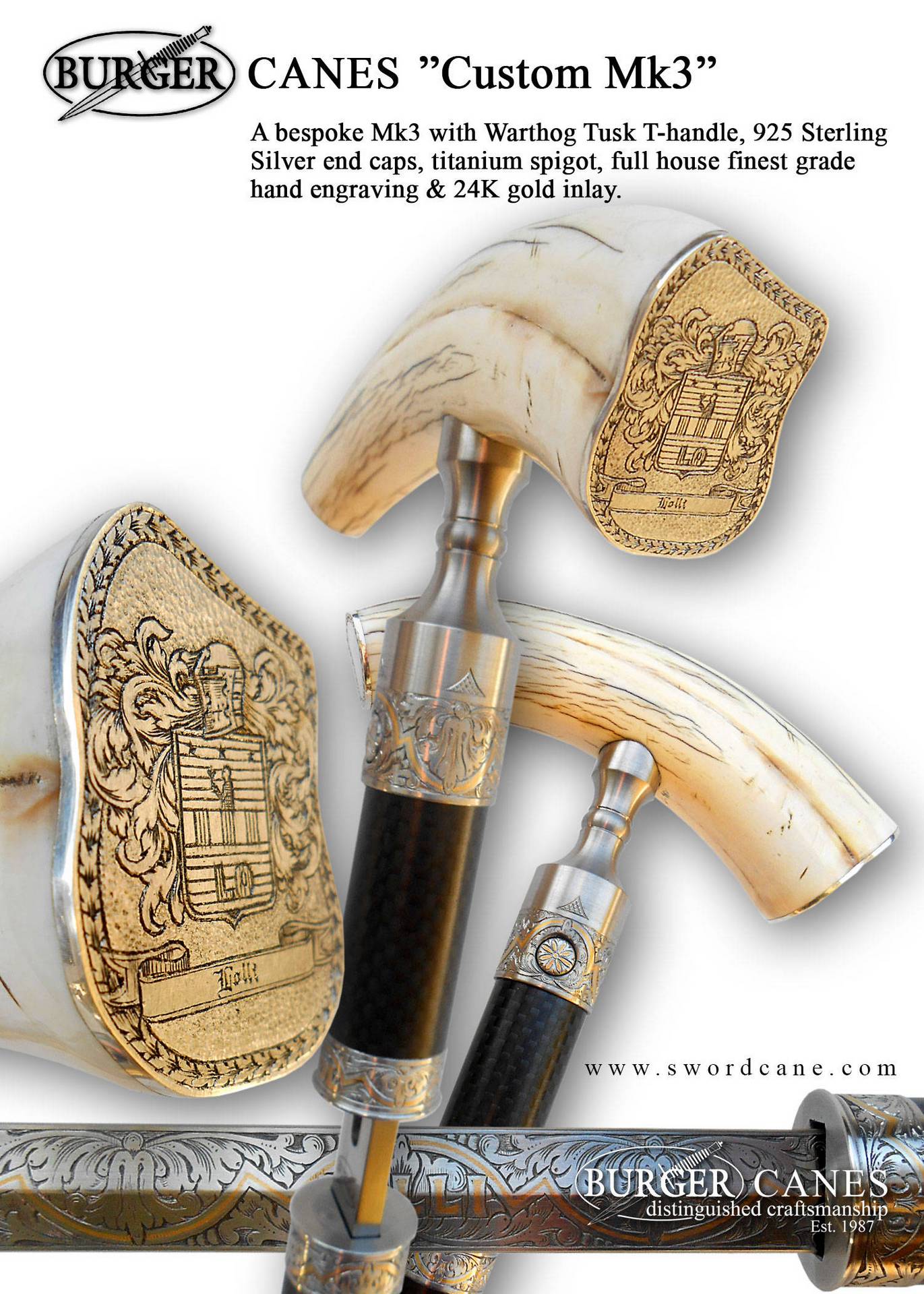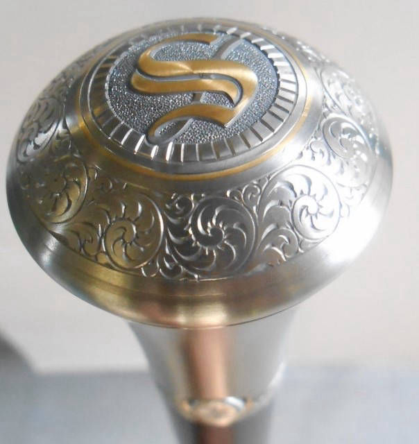 This level of custom handle engraving is normally combined with matching custom engraving on the external components of the sword cane, namely the release button, collars and both sides of the blade with option for 24K gold inlay. Transforming your order into a truly “functional art” cane and family heirloom.