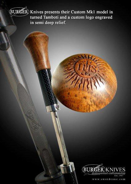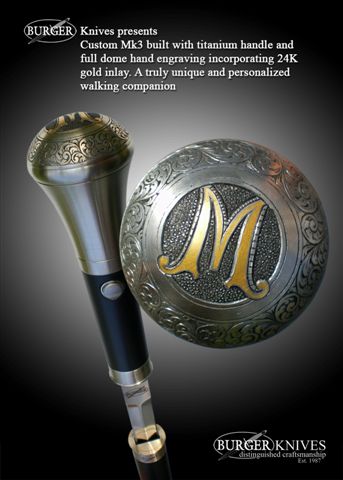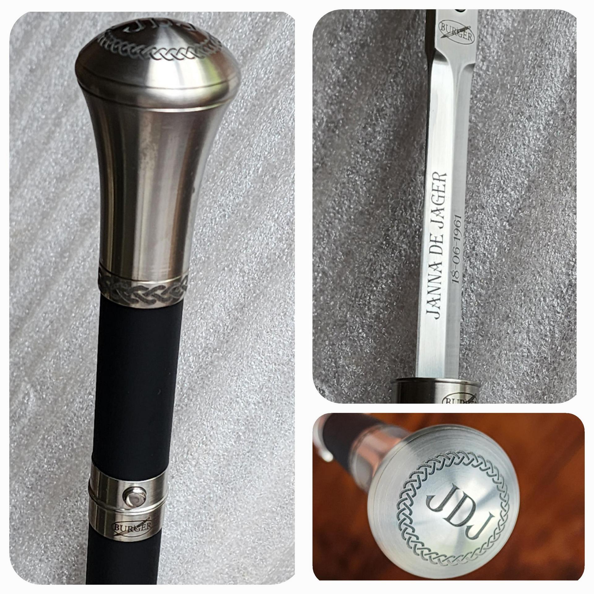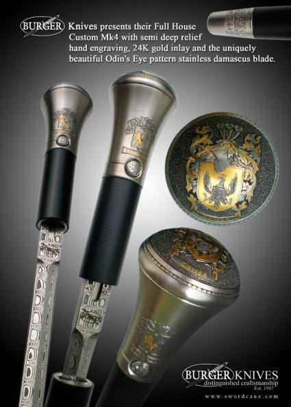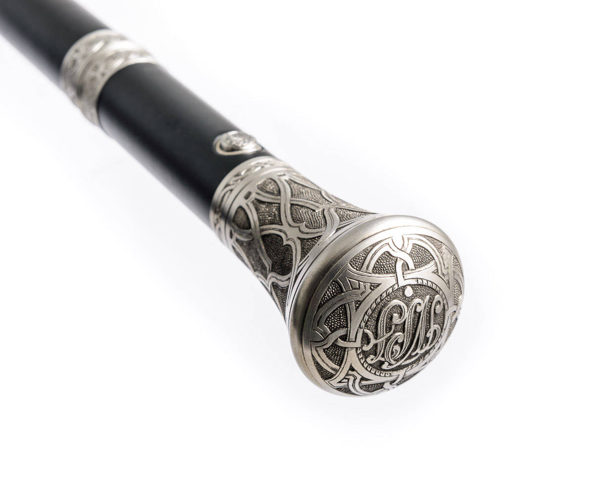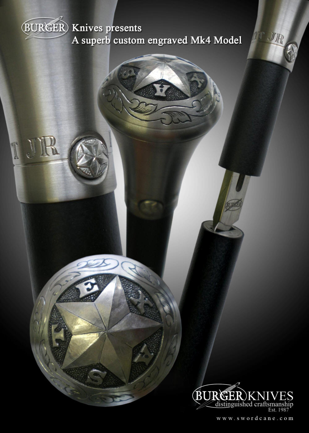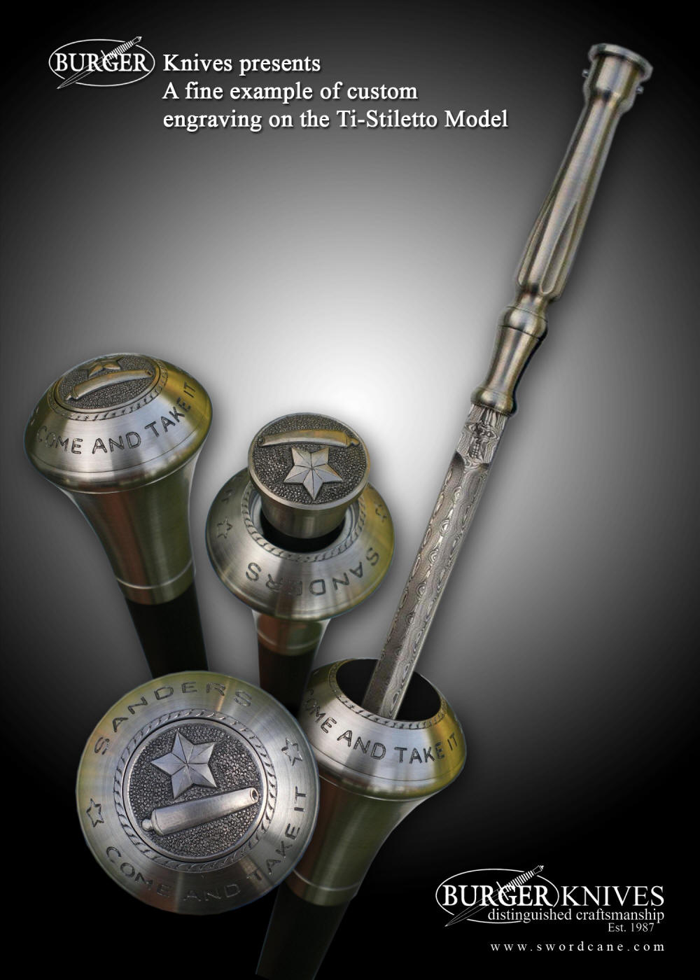 This level of custom handle engraving is normally combined with matching custom engraving on the external components of the sword cane, namely the release button, collars and both sides of the blade with option for 24K gold inlay. Transforming your order into a truly “functional art” cane and family heirloom.