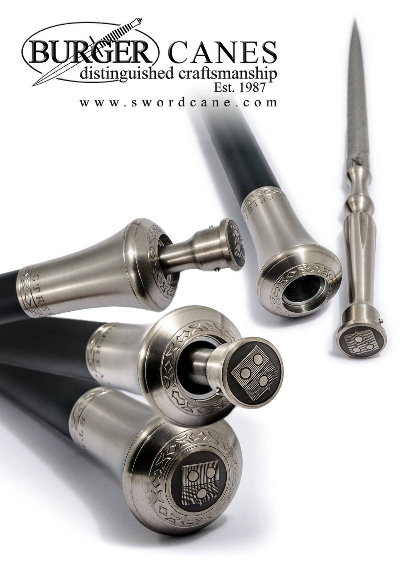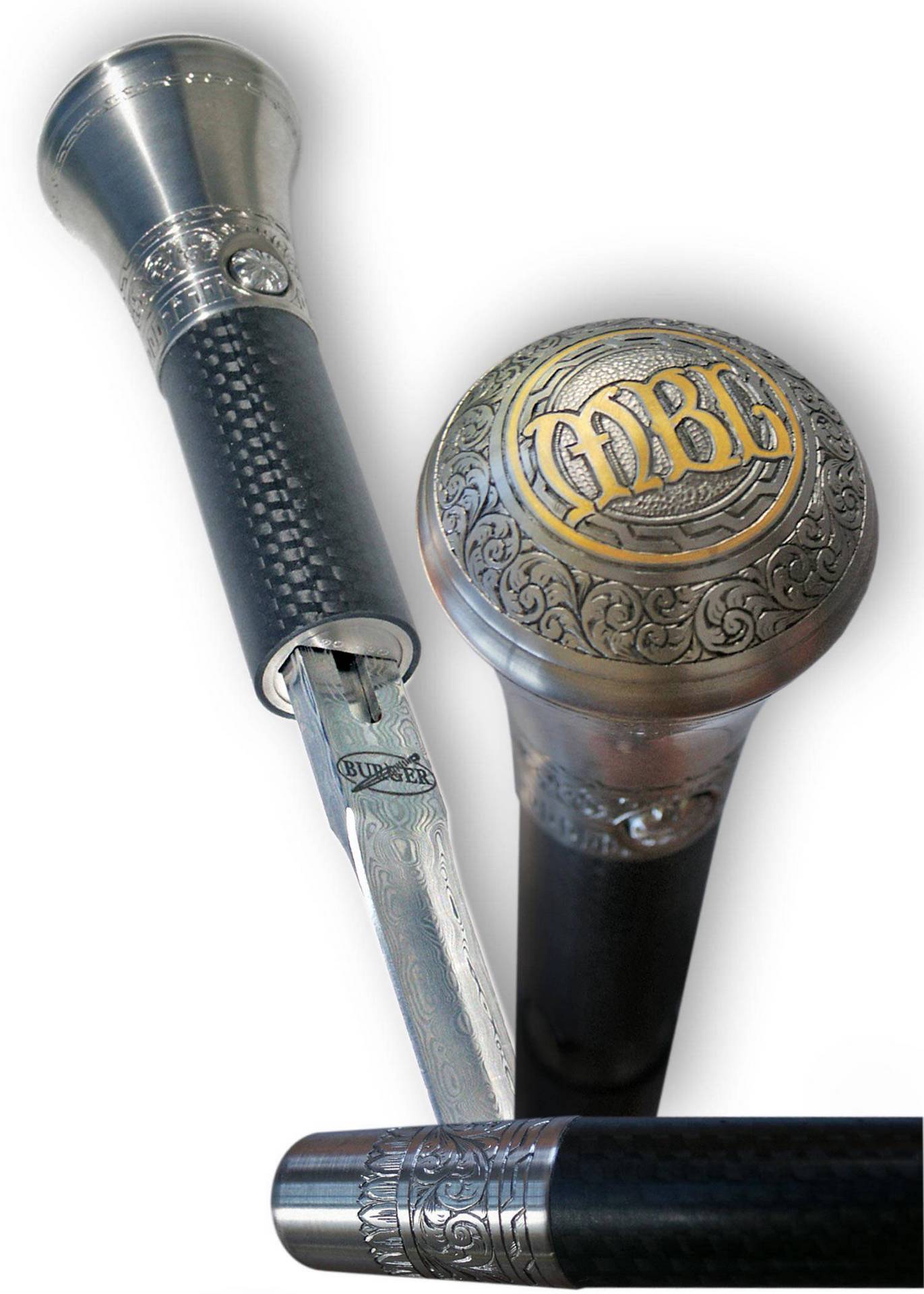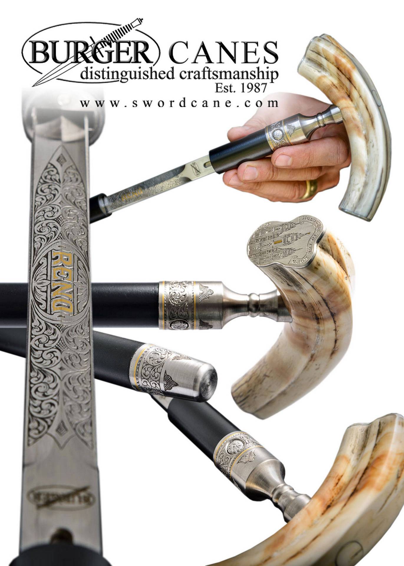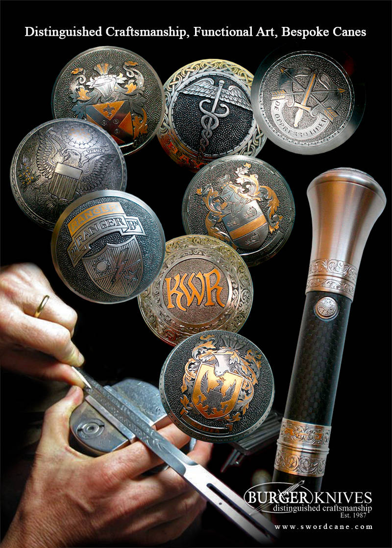 We have many different styles and options for personalizing our range of quality canes as can be seen in my file photos on this site. With over 65 years of combined experience in hand engraving, design, layout and building of the world’s finest bespoke canes I will guide and advice you on the best way forward, once we have established a basic design concept, and assure you of only the best advice. Please understand that each Custom Cane is hand built from scratch. This level of old world craftsmanship takes time! The average build time for a "Full House" best grade hand engraved custom cane is one to four months pending engraving details and option for 24K gold inlay. Work only starts once we have finalized all details and the 50% deposit has been secured. I use only the finest hand selected components for these bespoke custom canes with many hours of dedication to the finest details and attention to fit and finishes making your BURGER CUSTOM CANE a truly UNIQUE ONE OFF BESPOKE CANE and Family heirloom. As many clients have remarked…..simply- ”functional art”