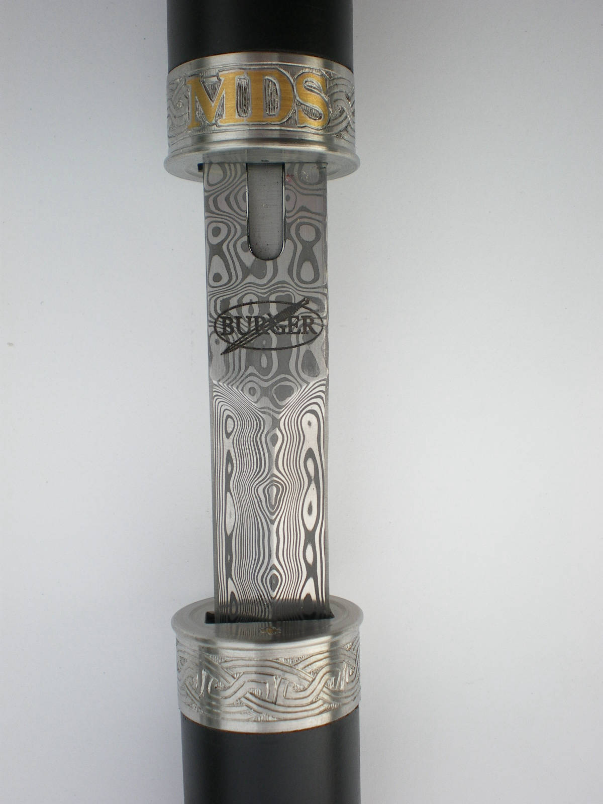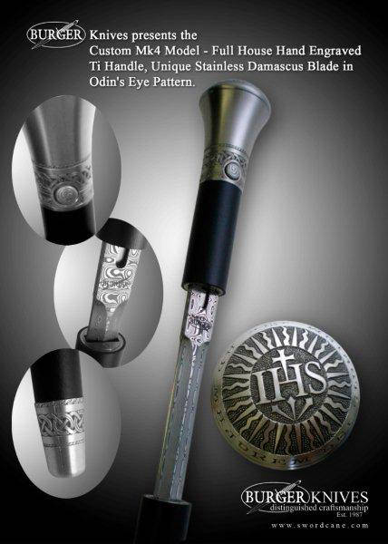 3. Another very Unique Custom Option Burger Canes has to offer is the very rare and unique- STAINLESS DAMASCUS BLADE upgrade in the ODIN'S EYE pattern, we only build this custom option into our Top End Classic MK3 - Discreet MK4 & Ti Stiletto model range. These unique Damascus blades compliment Best Grade hand engraving beautifully or is just a bespoke addition to an already unique piece of functional art.- Price on request.