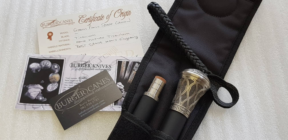 Dimensions- Overall length – 140cm/55” (In break down carry case 78cm/31”) -Blade length 450mm/17" -Shaft diameter 26mm/1" at collars tapered down to 21mm at multipurpose ferrule (rubber ferrule included with order) – Handle- Large Turned Tamboti (Diameter 45mm/1,8”ball and flute design) Weight 750 grams/27 ounces (approx.)